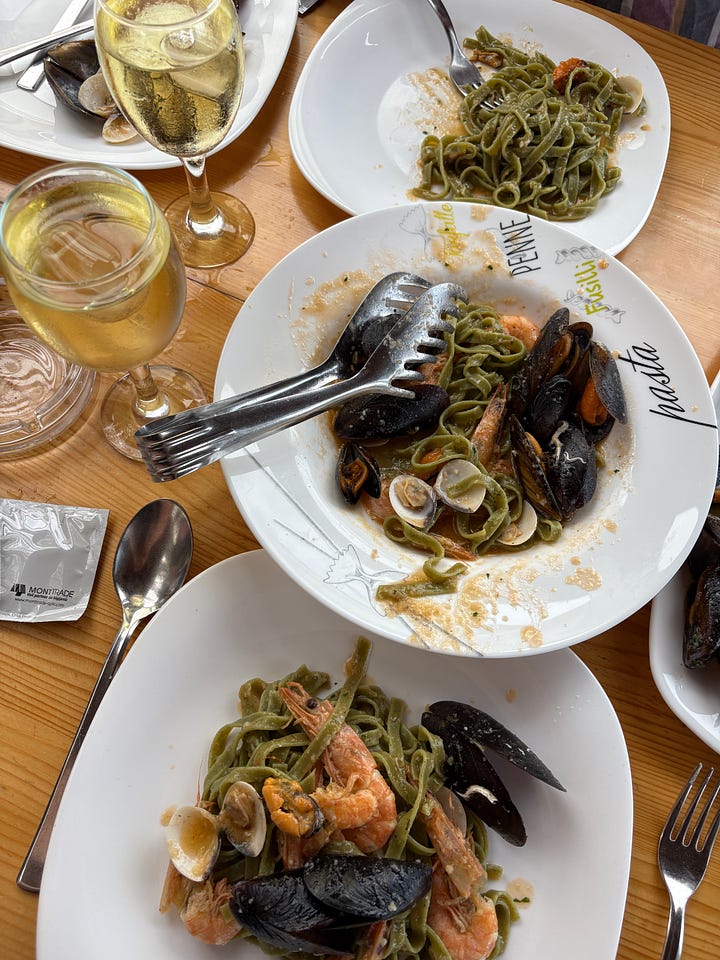 Better yet, there was Gego Restaurant, a mom and pop overlooking the beach. We splurged on an $85 lunch of Aperol spritzes, mussels, seafood pasta, house white wine served with ice cubes, espressos, tiramisu to share. I bummed a Parliament from the table next to us. And then we went back to swim and nap.